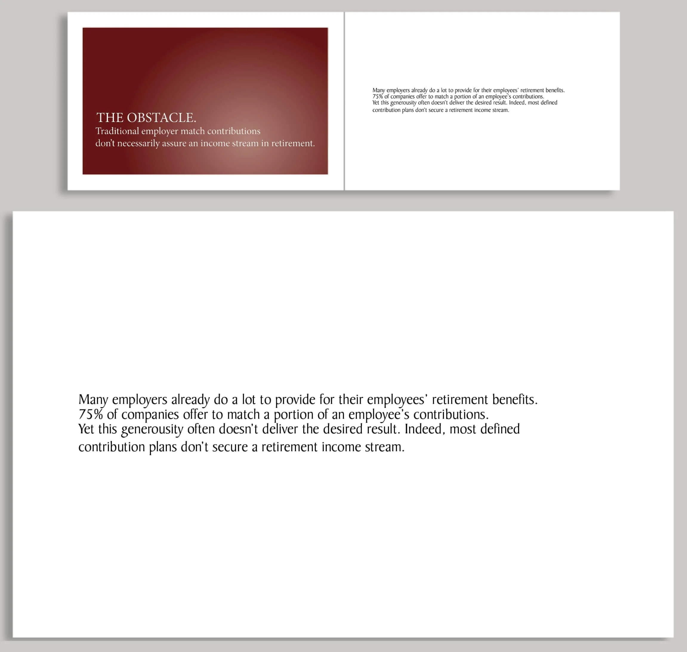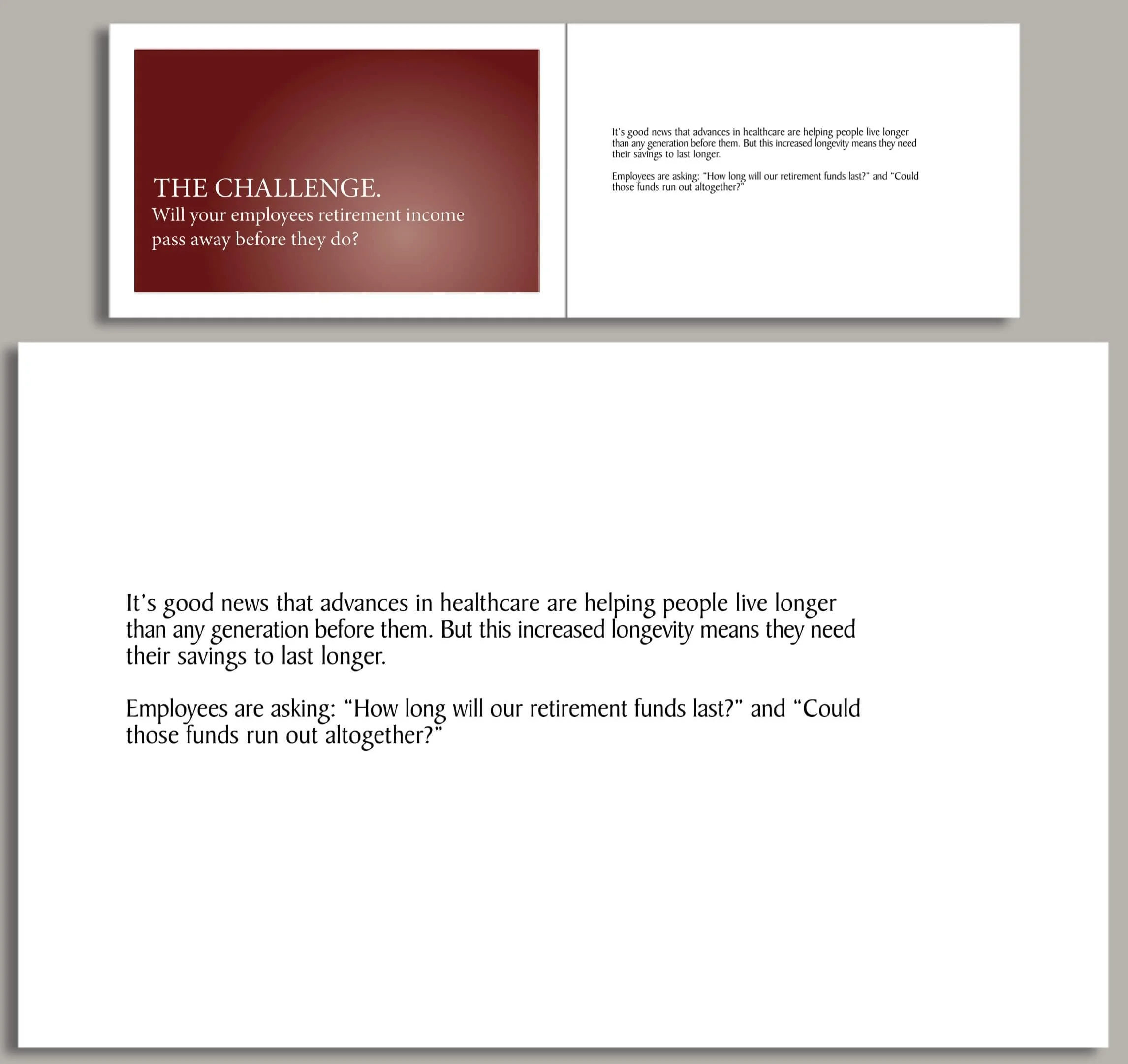 Message: Your existing pension plans may not last as long as your employees… Which could put you in contravention of your fiduciary duty. And make you potentially legally liable.