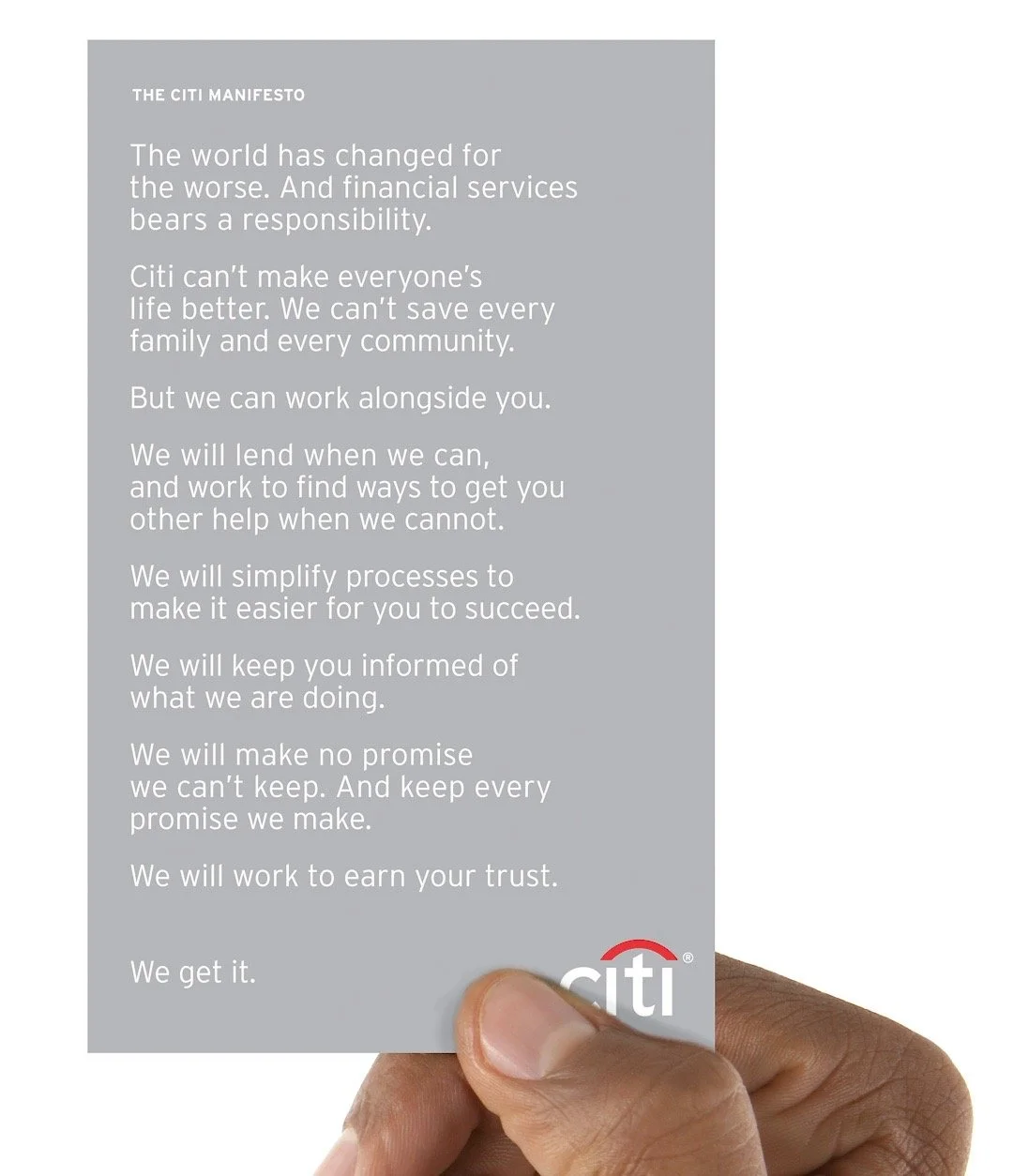 I start with a manifesto. Based on an idea in Neitszche. That true strength doesn’t come from status or bombast but from the simple power to keep your word. Citi had been humbled. But we’d learned. In future we’d make fewer, simpler promises. But keep every promise we’d make. The new Citi wasn’t above humanity, granting wishes. But working within communities, alongside people helping them rise in practical ways.